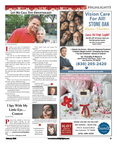 Let Me Call You SweetheartVision Care For All!ooooooooooooooooooLove At First Sight!Get 20% OFF all frames when youfind that perfect match.See office for more details.Expires 2/28/25oooooooooooooooooo• Diabetic Eye Exams • Glaucoma Diagnosis/Treatment • Pediatric Myopia Control • Emergency Eye Exams• Dry Eye Treatment • Glasses & ContactsDr. Chandler R Mann II 20079 Stone Oak Pkwy., Suite 1104 San Antonio, TX 78258(830) 205-2420www.stoneoakvisionsource.comBy Sonny MelendrezIf there is one term of endearment that will always bring a rush of warm memories of my mom, it is what she called my brother Rick and me all our lives: sweetheart.This will be our third Valentine’s Day without her, but certainly not without her spirit.As a little boy, I would say “Balentine” instead of Valentine and from then on, we’d laugh when she asked, “Will you be my Baaalentine?!”For as long as we can remember, Rick and I would receive an anonymous card in the mail each year, postmarked “Valentine, Texas.”It would be decades before we realized they were sent by the one who loved us most!When I was 10 years old, I entered my first radio contest, with Mom’s help.Every afternoon, the host on WOAI Radio would chat with a listener, (an adult listener) asking them to talk about themselves and then awarding a prize, usually movie passes.I wanted those tickets.It seemed like every time I tried to dial in, the line was busy.Until, one day, it rang.I quickly handed the phone to my mom. She looked at me and said, “Sweetheart,I don’t know what to say!”I Spy With MyLittle Eye...ContestBy Sally KalosP lease look carefully on each and every page, scanning up and down, left and right, from front toback, and then back to front. Don’t give up! If you can find cupid you’ll be entered into a drawing to win $50! Just email the page number and location where you spotted cupid to contest@stoneoakhighlights.com.The deadline is February 9, 2025.“Don’t worry mom, just answer the questions.”And so, my mom made her radio debut as her sweet voice filled the airwaves across South Texas. As the conversation ended, Mom was asked to share her favorite song.“Stardust by Nat King Cole,” she softly replied.She was given the passes, said goodbye and the song began to play.“Thanks Mom! You were great!”“You’re welcome, sweetheart.”Little did she know that this would be thefirst of many future broadcast appearances, on my radio shows, both here in San Antonio and in Los Angeles, as I would often share, with listeners, our conversations on special occasions, including her birthday, Mother’s Day, Christmas and yes, Valentine’s Day.Each of those calls would end the same way.“I love you mom.”“I love you, too, sweetheart!”Sonny Melendrezis an award-winningmotivational speaker,Hall of Fame radio/TV host and author,based in San Antonio.For more of his enthusiastic brand of inspiration and speaking information, visit www.SonnyMelendrez.com and listen to his podcast.We hope you’ll have fun with our version of a mini-scavenger hunt within our pages. Good luck!Congratulations to our DecemberI Spy winner Margi FischerMore Cake. More Love.ORDER ONLINE! WE DELIVER!San Antonio - Stone Oak700 E. Sonterra Blvd San Antonio, TX 78258(210) 495-2253$5 OF Forders of $25 or more Exp. 2-28-25February 2025www.stoneoakhighlights.com 5