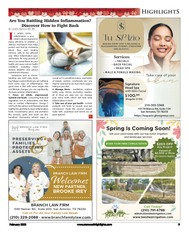 MAKING EVERY VISIT A RELAXING & REJUVENATING JOURNEY, STRESSFREE AND BLISSFULServices:• ••••••••••••• ••••••••••••• ••••••••••••• • • • • • • • • • • • • • BACK FACIAL • •••••••••••• • HEAD SPA• FACIALS• MALE & FEMALE WAXINGSignature Head Spawith Mini Facial$1OO.oo (Regular $150)19178 Blanco Rd, Suite 104 San Antonio, TX 78258https://tuspazio.glossgenius.com• •••••••••••• • ••••••••••••Take care of your• ••••••••••••••••••••• • ••••••••••••••••••••• • ••••••••••••••••••••• • ••••••••••••••••••••• • ••••••••••••••••••••• • ••••••••••••••••••••• • •••••••••••••••••••••210-303-5568Are You Battling Hidden Inflammation? Discover How to Fight BackIBy Caitlin Ogletree MS, RDn simple terms, inflammation is your body’s natural response toinjury, infection, or irritation- a defense mechanism that helps protect and heal by increasing blood flow and sending immune cells to the affected area. When inflammation goes unchecked, for long periods of time, it can wreak havoc on your health and cause serious health conditions including heart disease, diabetes and various autoimmune diseases.Symptoms such as chronicbloating, gas, joint pain, brainfog, fatigue could indicate you are suffering from some type of inflammation. The good news is that with some simple diet and lifestyle changes, you can significantly decrease systemic inflammation.1. Focus on whole, unprocessed, nutrient rich foods - consuming fruits and vegetables rich in antioxidants and fiber help to combat inflammation. Omega 3 rich foods like salmon and flaxseed provide healthy fats and help to lower inflammation levels. Incorporating spices and aromatics like turmeric, garlic and onion are also beneficial. Decreasing refined sugar is• • • •• • •• • • • • •• • •• • •• •••••••• • ••••••• • ••••••• • ••••••• • ••••••• • ••••••• • ••••••• •crucial as it is proinflammatory- read labels of breads, crackers, condiments etc- you may be surprised to see how much sugar is hiding in your diet.2. Manage Stress - meditation, outdoor walks, yoga classes, journaling, reading- all of these are ways you can manage your stress levels which will help keep inflammation in check.3. Take care of your gut health - include probiotic rich foods to nourish your gut microbiome- foods like coconut yogurt, water kefir, sauerkraut and kimchi are all great options!•• •• •• •• • • •• ••Spring Is Coming Soon!Get your yard ready with our top-notch irrigation and landscape services.BOOK YOUR FREE CONSULTATION$200 OFF Any Project!Valued at $2,000 or More (Exclusions Apply).Call Today!(210) 791-6788 admin@benitezirrigation.comwww.benitezirrigation.comWelcomesNEW PARTNER, BROOKE IREYBRANCH LAW FIRMBRANCH LAW FIRM549 Heimer Rd., Suite 200, San Antonio, TX 78232Call Us For All Your Family Law Needs(210) 229-2088 • www.branchfamilylaw.comFebruary 2025www.stoneoakhighlights.com9