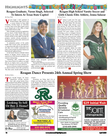 Reagan Graduate, Varun Singh, Selected To Intern At Texas State CapitolReagan High School Varsity Soccer and Girls Classic Elite Athlete, Jenna SalazarKBy Tracy Petersicking in goals since five years old, soccer is truly a way of life for Jenna Salazar. She now playsvarsity for Reagan High School’s soccer team and the “05 Girls Classic Elite ECRL/ ECNL teams.” All in for the long run, Salazar will be playing D2 level soccer at Durango Colorado, Fort Lewis College. A love for criminology, as she is in Reagan’s forensic science club, Salazar will be majoring in criminology. From sweat and tears, Salazar has accomplished the following: “Summa Cum Laude Grad, E-N Player of the Week, E-N Athlete of the Week, 2nd Team All District Forward, three-year Varsity Letterman, four- year Academic All District, and involved in the Paws Cause and Japanese clubs.”About to graduate, Salazar has made a point to reflect back on her pivotal moments and how exactly she got there. Every day in class or on the field, there was something to pause and take in, to glean from, especially celebrating the big wins with her team. Reflecting from her soccer journey, Salazar notes how much grit it really takes to succeed,“There will always be a bad game here and there, but your ability to overcome and shake off any feelings of self-doubt is important to being successful in any aspect of life.”VBy Paige Wolfarun Singh, a 2021 graduate of Ronald Reagan High School and a current student at Texas A&MUniversity, recently began an internship in Austin, Texas at the State Capitol, acting as an integral part of the Office of State Representative Nicole Collier.After a lengthy and rigorous application process, Varun, a Public Health major, was selected for the Public Policy Internship Program (PPIP) at Texas A&M. Through the program, students actively participate in the policy process at the state, national, and international levels.“A substantial portion of the public health field involves policy development, so interacting with policy at the state level will allow me to better understand how policy works at higher levels like federal and international,” explained Varun.As the former Director of Model United Nations at Reagan, Varun’s training and experiences in that role are invaluable to the work he is doing today.“Interacting with constituents from Texas House District 95 reaffirms my belief that we, as citizens, have a voice and the forum is set up for us to use it,” said Varun.Varun is on the pre-med track and aspires to attend medical school after graduating. “My ideal career would include balancingclinical work alongside government relations,” said Varun.ThroughthePPIP,Varunhasbeenableto experience a once-in-a-lifetime opportunity while working toward his personal and professional goals.Reagan Dance Presents 24th Annual Spring ShowTBy Becky Daileyhe Ronald Reagan HS Dance Department proudly presents their 24th annual Spring Show,“Simply the Best!”Fresh off their competition season, the Diamond Dancers, Silvers Stars, and Charmers pep squad have been hard at work with choreography and rehearsals. The audience can expect to see a variety of styles, such as jazz, lyrical, hip hop, contemporary and their traditional kick routine. The show will also include performances from Reagan Cheer, Prop Pops, and special guests. Join us as we close another fabulous year of Reagan Spirit and bid farewell to our amazing Classof 2023!Showtimes are Friday, April 21st at6:30pm and Saturday, April 22nd at 3pm in the Reagan HS auditorium. Please visit @ReaganSpirit on Facebook, Instagram, or Twitter in mid-April for the link to purchase tickets.$29 Initial Visitincludes consultation exam & adjustment. No appointment needed. No insurance needed. *offer valued at $4522100 Bulverde Rd. Ste. 110. SA TX 78259 • 210.972.5985Have Your Pet Hop On In!We Offer:• Daycare • Overnight Boarding • Grooming • Cattery • Beach Club • Dock Diving • Pet Bakery • Award Winning Trainingk9countryclub.netBook Today!Spring & Summer weekends fill fast... especially holidays! Don’t Miss Out!830-980-8476 31305 Oakview Rd., Bulverde, TX 78163Looking To SellOr Buy A Home?17 Years’ ExperienceNelly Rose-REALTOR®THE NELLY ROSE GROUPRE/MAX North-San Antonio 21720 Hardy Oak Blvd., SA, TX 78258Habla Españolwww.homesbynelly.comProvidingQuality Services& Customer CareTax & Financial Services• Tax Services• Bookkeeping & Payroll • Consulting Services22211 W IH-10, Suite1206 San Antonio, TX 78257(210) 650-2944www.oldoaktax.com10www.stoneoakhighlights.comApril 2023I can help! Call Today.210-693-3105