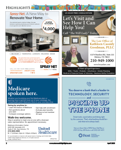 1/2 HOUR FREE CONSULTATION!Let’s Visit and See How I Can Help You!Call “The Will Lady” Today!The Law Office ofKathleen Cassidy Goodman, PLLC12274 Bandera Rd., Suite 222www.BexarLaw.comHelotes, TX 78023210-949-1000 www.bexarlaw.com25 Years of Legal ExperienceWills • Trusts • Probate • Inheritance • Estate Planning Medical & Financial Power of Attorney • Business Entity FormationSpray-Net. A New Way to Renovate Your Home.Our patented paint solution bridges the gap A NEW between replacing &refacing your kitchen cabinets KITCHENin one quick & cost-effective service.starting at$4,000 BEFORE NOWW E P A I N T THERMOFOIL · LAMINATE · MELAMINE · WOODOur patented and customized paint solutions ensure that we achieve a factory finish for every application, backed byour 15 YEAR WARRANTY against peeling.CALL US FOR YOUR FREE QUOTE!SPRAY-NET SAN ANTONIO NORTHSPRAYNET.COM210.871.1206Medicare spoken here.Whether you’re picking your first Medicare plan or learning how to get the most out of your coverage, the UnitedHealthcare® Medicare Store is your one-stop shop.Swing by anytime to:• Learn the basics of Medicare• Ask questions about your plan• Compare coverage optionsWalk-ins welcome.• Get help with enrollment• Activate plan benefits• Replace a lost member ID cardStop in anytime to meet one-on-one with a licensed sales representative. No appointment necessary.Medicare Information Center 2455 NE Interstate 410 Suite # 100, San Antonio, TX 210-809-4965M - F (9:00am-12pm & 1:00pm-4:00pm)For accommodations of persons with special needs at meetings call 210 809 4965,©2020 United HealthCare Services, Inc. All rights reserved. Y0066_21SPRJ57798_CSPRJ577982 www.stoneoakhighlights.com April 2023