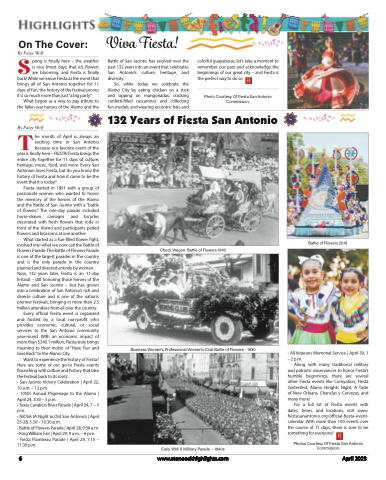 On The Cover:SBy Paige Wolfpring is finally here – the weatheris nice (most days, that is!), flowersare blooming, and Fiesta is finally back! While we know Fiesta as the event that brings all of San Antonio together for 11 days of fun, the history of the festival proves itissomuchmorethanjust“abigparty.”What began as a way to pay tribute to the fallen war heroes of the Alamo and theTBy Paige Wolfhe month of April is always an exciting time in San Antonio because our favorite event of theyear is finally here – FIESTA! Fiesta brings the entire city together for 11 days of culture, heritage, music, food, and more. Every San Antonian loves Fiesta, but do you know the history of Fiesta and how it came to be the event that it is today?Fiesta started in 1891 with a group of passionate women who wanted to honor the memory of the heroes of the Alamo and the Battle of San Jacinto with a “battle of flowers.” The one-day parade included horse-drawn carriages and bicycles decorated with fresh flowers that rode in front of the Alamo and participants pelted flowers and blossoms at one another.What started as a fun-filled flower fight, evolved into what we now call the Battle of Flowers Parade. The Battle of Flowers Parade is one of the largest parades in the country and is the only parade in the country planned and directed entirely by women. Now, 132 years later, Fiesta is an 11-day festival – still honoring those heroes of the Alamo and San Jacinto – but has grown into a celebration of San Antonio’s rich and diverse culture and is one of the nation’s premier festivals, bringing in more than 2.5 million attendees from all over the country.Every official Fiesta event is organized and hosted by a local non-profit who provides economic, cultural, or social services to the San Antonio community year-round. With an economic impact of more than $340.1 million, Fiesta truly brings meaning to their motto of “Have Fun and Give Back” to the Alamo City.Want to experience the history of Fiesta? Here are some of our go-to Fiesta events flourishing with culture and history that take the festival back to its roots:• San Jacinto Victory Celebration | April 22, 10 a.m. – 12 p.m.• 105th Annual Pilgrimage to the Alamo | April 24, 3:30 – 5 p.m.• Texas Cavaliers River Parade | April 24, 7 – 9 p.m.• NIOSA (A Night in Old San Antonio) | April 25-28, 5:30 – 10:30 p.m.• Battle of Flowers Parade | April 28, 9:30 a.m. • King William Fair | April 29, 9 a.m. – 6 p.m.• Fiesta Flambeau Parade | April 29, 7:15 – 11:30 p.m.Viva Fiesta!Battle of San Jacinto, has evolved over the past 132 years into an event that celebrates San Antonio’s culture, heritage, and diversity.So, while today we celebrate the Alamo City by eating chicken on a stick and sipping on mangonadas, cracking confetti-filled cascarones and collecting fun medals, and wearing eccentric hats andcolorful guayaberas, let’s take a moment to remember our past and acknowledge the beginnings of our great city – and Fiesta is the perfect way to do so.Photo Courtesy Of Fiesta San Antonio Commission.132 Years of Fiesta San AntonioChuck Wagon Battle of Flowers 1940Business Women’s Professional Women’s Club Battle of Flowers - 1930• All Veterans Memorial Service | April 30, 1 –2p.m.Along with many traditional military and patriotic observances to honor Fiesta’s humble beginnings, there are several other Fiesta events like Cornyation, Fiesta Gartenfest, Alamo Heights Night, A Taste of New Orleans, Chanclas y Cervezas, and many more!For a full list of Fiesta events with dates, times, and locations, visit www. fiestasanantonio.org/official-fiesta-event- calendar. With more than 100 events over the course of 11 days, there is sure to be something for everyone!Photos Courtesy Of Fiesta San Antonio Commission.Battle of Flowers 2019Early WW II Military Parade - 1940s6www.stoneoakhighlights.comApril 2023