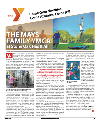 THE MAYSFAMILY YMCA at Stone Oak Has It AllBy Paige WolfW hether you’re involved in club sports, considered an athlete, or just looking for a place to get your daily exercise in, we all know about the YMCA. However, theYMCA is so much more than a gym – it is a community.The YMCA came to San Antonio 140 years ago and now has 12 state-of-the-art fitness centers across San Antonio, Boerne, Cibolo, Schertz, and New Braunfels. However, Stone Oak neighbors, the YMCA right in our backyard has recently transformed into one of the few elite YMCA Performance Training Centers.Our Performance Training Centers are more dedicated to individualized training.Osiris Estrada, Association Director of Wellness and Personal Training at the YMCA of Greater San Antonio, explained the development of the new program.“We recently transformed our Stone Oak branch into a Performance Training Center. Our Performance Training Centers are more dedicated to individualized training, strength development, power and endurance growth, coordination, and injury reduction for members of all ages and fitness backgrounds,” said Estrada.The Mays Family YMCA at Stone Oak Performance Training Center differs from other YMCAs because it provides one-on-one and small group training for athletes and non-athletes alike. Since the Performance Training Centers work on individual and small-class structures, this ensures every member gets the time and attention theyneed from the Y’s expert trainers in order to reach their personal fitness goals.“The quality of our trainers is something we take great pride in,” said Estrada. “We bring in expert instructors that are knowledgeable and know how to connect with our members at the level of support they need.”Along with offering one-on-one coaching and small classes, the Mays Family YMCA at Stone Oak transformed into a Performance Training Center to offer top-of-the-line performance training to members from all backgrounds.“Our whole concept was to take something [performance training] that is normallythousands of dollars, whether that be through club sports, group fitness center classes, or personal trainers, and offer it to our community at an affordable price,” explained Estrada.“While we do offer financial assistance to those who qualify, we wanted to be able to offer that same caliber of training at a low cost so everyone, of all ages and athletic ranges, has that opportunity.”While the YMCA is historically known for kids’ and teens’ programs, adults are not forgotten! The YMCA has a specialized program for adults 55+ called “Strong and Steady,” consisting of the same concepts of strength building, mobility, and endurance like the Performance Training Program. “Strong and Steady” is taught by expert fitness instructors, and all exercises and workouts are adjusted to each member based on their needs and goals.“While we still serve our youth, we will continue to increase the number of programs we offer for adults as well,” said Estrada.In addition to the development of the Performance Training Center, there are some new and exciting programs the Mays Family YMCA at Stone Oak has to offer, including The GAP, Vertimax Training, and Pilates Reformer.The GAP, a program specially designed by the YMCA, offers recovery training sessions for individuals who have recently suffered an injury. The GAP acts as a bridge between the time a member is done with physical therapy and cleared by their physician to getting back to their normal, everyday life.Vertimax Training is ideal for young athletes who want to develop cutting-edge performance skills. Done by jumping with resistance bands up on to a platform box, this exercise will increase endurance and strength like no other.Strong and Steady program .Another great addition to any athletes’ regime, or really anyone who wants to increase their strength, mobility, and flexibility, is Pilates Reformer. The apparatus consists of a sliding bed with springs, ropes, and pulleys. “Pilates works a lot on mobility, core strength, flexibility, and posture,” said Estrada. “Since Pilates is done on a machine based on spring resistance, it’s very low impact and easy on your joints.”“Coming to the Mays Family YMCA at Stone Oak is more than just getting a workout – it’s getting to know your neighbors and people with similar goals, working on your personal health goals with our educated instructors and trainers, and being able to try something new every time you come in,” said Estrada.So, whether you’re taking the first step in your fitness journey, you’re an athlete looking to develop innovative skills, or you’re on the hunt for new workouts to add into your routine, the Mays Family YMCA at Stone Oak Performance Training Center is the place for you. Be prepared to better your physical health, develop new skills and strengths, and find a community of people.To learn more about the Mays Family YMCA at Stone Oak Performance Training Center, call 210-497-7088 or visit their website at www.YMCAsatx.org/MaysStoneOak to schedule a tour of the facility at 21654 Blanco Road.April 2023www.stoneoakhighlights.com9Come Gym Newbies, Come Athletes, Come All!