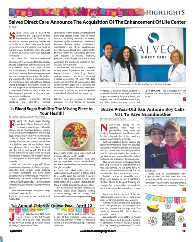 Salveo Direct Care Announce The Acquisition Of The Enhancement Of Life CenterBy StaffS alveo Direct Care is pleased to announce the acquisition of the Enhancement of Life Center and isexcited to continue providing healthcare to Dr. Becker’s patients. We look forward to meeting you and earning your trust in managing your healthcare needs. We wish Dr. Becker all the best in her well-deserved retirement.At Salveo Direct Care, our dedicated physicians, Drs. Monica and Prisiliano Salas, provide exceptional, patient-centered care to individuals across the United States and Latin America. Specializing in lifestyle medicine, longevity, hormone replacement therapy, primary care, cardiovascular health, and nutrition, they bring a comprehensive and holistic approach to healthcare. With a shared philosophy that health awareness and the adoption of healthy habits are the cornerstones of effective medical care, Drs. Salas empower patients to take an active role in their well-being.Our practice seamlessly blends traditional and alternative medicalapproaches to offer personalized treatment plans that address a wide range of health concerns, including cardiovascular health, digestive health, metabolism, bioidentical hormone therapy, athletic performance optimization, and stress management. Recently, Salveo Direct Care welcomed Dr. Sharvari Parghi, an outstanding physician with expertise in internal medicine, pediatrics, and lifestyle medicine, further enhancing the depth and breadth of care available to our patients.Furthermore, we provide a bespoke Outlive Health Experience that combines luxury, advanced technology, holistic and personalized care in a customized medical assessment of over 900 data points and more than 15 examinations. This comprehensive approach is designed for individuals, couples or business executives who seek a unique and multidisciplinary medical evaluation all within a single day.Whether you are seeking a personal physician for your family or businessDr. Prisiliano Salas, Jr. , Dr. Monica Salas and Dr. Donna Beckerworkforce, a personal health assistant for your medical needs, or looking for additional support in achieving long-term health and longevity, our team is available to assist you. Visit https://salveodirectcare.com or call(210) 899-2549. They are located at 14603 Huebner Rd, Suite 3402, San Antonio, TX 78230.Is Blood Sugar Stability The Missing Piece to Your Health?FBy Caitlin Ogletree, Registered Dietitianeeling off? Blood sugar stability may be to blame. This overlooked, yet very important aspect of healthplays a role in hormonal balance, energy levels, cravings and metabolism- meaning it pays a crucial role in your overall well-being.Blood sugar fluctuates throughout the day in response to various factors. The carbohydrates you eat are broken down into glucose, which are then shuttled into the cell for energy with the help of insulin. When blood sugar levels fluctuate dramatically in response to excessive sugar or carbohydrate intake this cycle becomes unstable.How are hormones impacted? When insulin is overstimulated, it affects estrogen, progestin and cortisol levels, leading to various symptoms that have been categorized as “perimenopause symptoms”. Additionally, increased insulin promotes chronic inflammation which can contribute to more serious conditions like autoimmune disease.Here are some simple strategies to keep your blood sugar stable:1. Center your meals around protein and healthy fatsBrave 9-Year-Old San Antonio Boy Calls911 To Save Grandmother2. Move after meals- take a walk or bust out a minute of body weight squats3. Fiber rich carbohydrates- fruits and starchy vegetables contain carbohydrates, but are also rich in fiber, ultimately lessening the glucose spike.4. Don’t eat naked carbs- pair your carbohydrates with protein or fat (or both) to lessen the spike. For example, if you are going to eat a cookie, pair it with some greek yogurt or a scoop of peanut butter- this will help to decrease the glucose spike.By making small changes, women can improve blood sugar stability, leading to better energy, reduced cravings, and balanced hormones for long-term health.doing well.Randy and his grandmother sharea special bond, and this event has only strengthened it. His heroic actions serve as a reminder of how even the youngest among us can rise to the occasion in times of crisis.Submitted By Laura PalmaNsuddenly fainted due to a medical episode. As she collapsed, she hit her head and became disoriented from the fall.Without hesitation, Randy sprang into action. He immediately called 911, provided the operator with their address, and ensured help was on the way. He then opened the door for paramedics and rushed to alert his grandfather, who was on the other side of the house and unaware of the emergency.Throughout the ordeal, Randy remained calm and reassured his grandmother that help was coming. At the same time, he called his mother, who was at work. The two stayed on the phone as she rushed home.Randy’s mother is incredibly proud of her son’s bravery in such a frightening situation. Thanks to his quick thinking and courage, his grandmother received the medical attention she needed and is nowDon’t miss the excitement of the live, judged queso contest, where we’ll award prizes for 1st, 2nd, and 3rd place winners!Admission is free and open to the public. If you think you’ve got the best queso and want to compete for the top prize, find details by scanning QR code on how to enter the contest.We can’t wait to see you at the 1st Annual Chips and Queso Fest! Located at parking lot at Integrity Home Mortgage of Texas at 1718 Dry Creek Way, San Antonio, TX 78259.ine-year-oldspendinggrandmother, Mary, when sheRandy Jr. was time with his1st Annual Chips & Queso Fest - April 12Bring your family and friends to enjoy a day of fun, including music, games, giveaways, activities for kids, free food and drinks, and a variety of queso dips to sample and savo