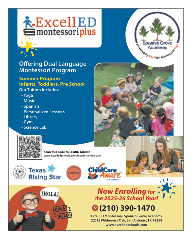 16Offering Dual Language Montessori ProgramSummer ProgramInfants, Toddlers, Pre School Our Tuition Includes:•Yoga• Music• Spanish• Personalized Lessons • Library• Gym• Science Lab!Scan this code to LEARN MORE!www.excelledschools.com/location/stone-oak/Now Enrolling for the 2025-26 School Year!(210) 390-1470ExcellED Montessori- Spanish Grove Academy22215 Wilderness Oak, San Antonio, TX 78258www.excelledschools.comwww.stoneoakhighlights.comApril 2025