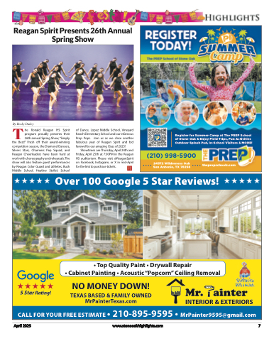 Register for Summer Camp at The PREP School of Stone Oak & Enjoy Field Trips, Fun Activities Outdoor Splash Pad, In-School Visitors & MORE!(210) 998-590024372 Wilderness Oak San Antonio, TX 78258theprepschools.comReagan Spirit Presents 26th Annual Spring ShowTBy Becky Daileyhe Ronald Reagan HS Spirit program proudly presents their 26th annual Spring Show, “Simplythe Best!” Fresh off their award-winning competition season, the Diamond Dancers, Silvers Stars, Charmers Pep Squad, and Reagan Cheerleaders have been hard at work with choreography and rehearsals. The show will also feature guest performances by Reagan Color Guard and athletes, Bush Middle School, Heather Stolle’s Schoolof Dance, Lopez Middle School, Vineyard Ranch Elementary School and our infamous Prop Pops. Join us as we close another fabulous year of Reagan Spirit and bid farewell to our amazing Class of 2025!Showtimes are Thursday, April 24th and Friday, April 25th at 7:00PM in the Reagan HS auditorium. Please visit @ReaganSpirit on Facebook, Instagram, or X in mid-April for the link to purchase tickets.Over 100 Google 5 Star Reviews!• Top Quality Paint • Drywall Repair• Cabinet Painting • Acoustic “Popcorn” Ceiling Removal5 Star Rating!NO MONEY DOWN!TEXAS BASED & FAMILY OWNED MrPainterTexas.comINTERIOR & EXTERIORSCALL FOR YOUR FREE ESTIMATE • 210-895-9595 • MrPainter9595@gmail.comApril 2025www.stoneoakhighlights.com 7