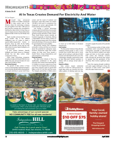 A Series On AIMBy Lou Dugganicrosoft Corp. announced another $1.4 billion investment in data centers west of SanAntonio, where the technology company has put together more than 1,400 acres of land. And the company also committed to building four data centers in Irving, Texas, as part of a larger presence that includes three additional data centers by QTS Realty Trust LLC.Apple recently announced that it is t aking another step in the artificial intelligence race, as it plans to build a quarter-million-square-foot factory in Houston, Texas, by 2026. At the facility, Apple will assemble servers that go into data centers to power Apple Intelligence, its current AI model.A joint venture between OpenAI, SoftBank, and Oracle, known as “Stargate,” already has ten data centers under construction in Texas.Other major technology companies, including Google and Amazon Web Services (AWS), have also announced plans for new data center facilities in Texas.Electricity DemandThe growth of data centers in Texas comes as state legislators attempt to balance such economic growth while ensuring there is enough electricity to power both thesecenters and the needs of residents and businesses. Large data centers can require 100 MW or more each. In comparison, one megawatt can power approximately 250 homes during a hot summer day.Last Energy, a nuclear technology company, plans to build thirty micronuclear reactors in Haskell County, Texas, to meet the growing energy demands of data centers. These small nuclear reactors provide six hundred megawatts of electricity, offering a dependable and low-carbon solution to Texas’s growing energy needs. The modular, factory-built design of microreactors allows for quick deployment and scalability.Micronuclear reactors face regulatory and public scrutiny, and there are concerns about the potential for radioactive waste. However, proponents argue that nuclear energy can help move Texas toward a cleaner future, energy independence, and reduced reliance on fossil fuels.Financial ImpactThe data center industry in Texas has significantly contributed to the state’s economy. Such centers were responsible for $1.9 billion in economic output across Texas in 2022. The new Apple factory and jobs are part of the company’s plans to spend $500 billion in the U.S. over the next four years. The Stargate partnership in Abilene plansto invest up to $500 billion in AI-related infrastructure.Job CreationThe data center industry in Texas directly employed 59,560 people in 2022, a 41% increase from 42,290 direct jobs in 2018. Apple will be looking to add about 20,000 research and development jobs across the United States. Stargate is expected to create at least fifty-seven full-time positions in Abilene with an average annual salary of $57,600.Impact on WaterData centers require substantial amounts of water for cooling purposes. A single data center can consume up to five million gallons of drinking water per day,enough to supply thousands of households or farms.The increasing number of data centers exacerbates water consumption faced by communities, especially in water-stressed areas. This can lead to conflicts over water usage and strain on local water supplies. Data centers also indirectly consume water through the electricity they require to operate. And the generation of this electricity often involves significant water use.Given the ongoing drought conditions and water supply challenges in Texas, the expansion of data centers could further stress the state’s water resources.AI In Texas Creates Demand For Electricity And WaterIn-Store Couponfamily-owned hobby store!$100FF$75I IIIII111111111111111Valid 3/1/25-3/34 1125. Limit one per customer. Cannot be combined with other offera ot applied to previous purchases. Purchase must meet minimum pre-tax amount to receive discount. Coupon can only be redeemed in-store at HobbyTown San Antonio. Some product exdusions apply. Return of discounted item(s) will be for the price actually paid and the value of this ooupon wlll be forfeited.The Vineyard *TXSA25NWS1* ShoppingCenter1604 & Blanco Rd.Located in the heart of Stone Oak, our Assisted Living Community offers a fun and energetic lifestyle while providing the personalized care you need.Take advantage of our current special.NO COMMUNITY FEE for all new residents!Call Today for Lunch and a Tour!20450 Huebner Road, San Antonio, TX 78258 210-615-4000 I IndependenceHill.com8www.stoneoakhighlights.comApril 2025