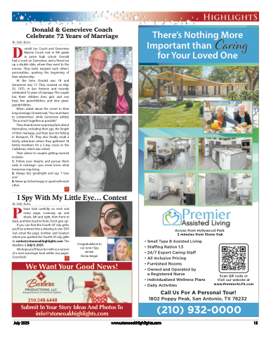 There’s Nothing More Important than Caring for Your Loved OneAcross from Hollywood Park2 minutes from Stone Oak• Small Type B Assisted Living• Staffing Ration 1:3• 24/7 Expert Caring Staff• All Inclusive Pricing• Furnished Rooms• Owned and Operated by a Registered Nurse• Individualized Wellness Plans• Daily ActivitiesScan QR code or Visit our website at www.PremierALFS.comCall Us For A Personal Tour!1802 Poppy Peak, San Antonio, TX 78232(210) 932-0000Donald & Genevieve Coach Celebrate 72 Years of MarriageDBy Sally Kalosonald Lee Couch and Genevieve Maxine Couch met in 9th grade at junior high school. Donaldhad a crush on Genevieve, and a friend set up a double date, where they went to the movies. They both enjoyed each other's personalities, sparking the beginning of their relationship.At the time, Donald was 18 and Genevieve was 17. They married on May 30, 1953, in San Antonio and recently celebrated 72 years of marriage. The couple has three children (two girls and one boy), five grandchildren, and nine great- grandchildren.When asked about the secret to their long marriage, Donald said, "You must learn to compromise," while Genevieve added, "Do as much together as possible."They shared some surprising facts about themselves, including their age, the length of their marriage, and their love for fishing in Rockport, TX. They also fondly recall a family adventure where they gathered 18 family members for a 5-day cruise to the Caribbean, which was a blast.Their advice to couples getting married includes:1. Follow your dreams and pursue them early in marriage—you never know what tomorrow may bring.2. Always kiss goodnight and say, "I love you."3. Never go to bed angry or upset with each other.I Spy With My Little Eye... ContestPBy Sally Kaloslease look carefully on each and every page, scanning up and down, left and right, from front toback, and then back to front. Don’t give up! If you can find the Fourth Of July grille, you’ll be entered into a drawing to win $50! Just email the page number and location where you spotted the Fourth Of July grille to contest@stoneoakhighlights.com. Thedeadline is July 9, 2025.We hope you’ll have fun with our versionof a mini-scavenger hunt within our pages. Good luck!Congratulations to our June I Spy winner Denia GeigerWe Want Your Good News!210.548.6448Submit In Your Story Ideas And Photos To info@stoneoakhighlights.comJuly 2025www.stoneoakhighlights.com 13