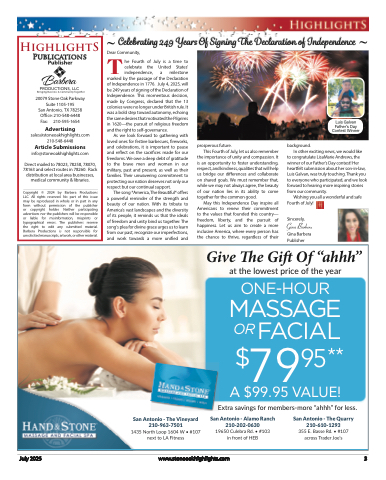 Celebrating 249 Years Of Signing The Declaration of Independence DTear Community,he Fourth of July is a time to celebrate the United States' independence, a milestonemarked by the passage of the Declaration of Independence in 1776. July 4, 2025, will be 249 years of signing of the Declaration of Independence. This momentous decision, made by Congress, declared that the 13 colonies were no longer under British rule. It was a bold step toward autonomy, echoing the same desires that motivated the Pilgrims in 1620—the pursuit of religious freedom and the right to self-governance.As we look forward to gathering with loved ones for festive barbecues, fireworks, and celebrations, it is important to pause and reflect on the sacrifices made for our freedoms. We owe a deep debt of gratitude to the brave men and women in our military, past and present, as well as their families. Their unwavering commitment to protecting our nation deserves not only our respect but our continual support.The song *America, The Beautiful* offers a powerful reminder of the strength and beauty of our nation. With its tribute to America’s vast landscapes and the diversity of its people, it reminds us that the ideals of freedom and unity bind us together. The song's plea for divine grace urges us to learn from our past, recognize our imperfections, and work towards a more unified andHighlightSPublications PublisherPRODUCTIONS, LLCBringing Business & Community Together20079 Stone Oak Parkway Suite 1105-195San Antonio, TX 78258 Office: 210-548-6448 Fax: 210-595-1654Advertisingsales@stoneoakhighlights.com 210-548-6448Article Submissionsinfo@stoneoakhighlights.comDirect mailed to 78023, 78258, 78070, 78163 and select routes in 78260. Rack distribution at local area businesses, medical community & libraries.Copyright © 2024 by Barbera Productions LLC. All rights reserved. No part of this issue may be reproduced in whole or in part in any form without permission of the publisher or copyright holder. Neither participating advertisers nor the publishers will be responsible or liable for misinformation, misprints or typographical errors. The publishers reserve the right to edit any submitted material. Barbera Productions is not responsible for unsolicited manuscripts, artwork, or other material.Luis Galvan Father's Day Contest Winnerprosperous future.This Fourth of July, let us also rememberthe importance of unity and compassion. It is an opportunity to foster understanding, respect, and kindness, qualities that will help us bridge our differences and collaborate on shared goals. We must remember that, while we may not always agree, the beauty of our nation lies in its ability to come together for the common good.May this Independence Day inspire all Americans to renew their commitment to the values that founded this country— freedom, liberty, and the pursuit of happiness. Let us aim to create a more inclusive America, where every person has the chance to thrive, regardless of theirbackground.In other exciting news, we would liketo congratulate LisaMarie Andrews, the winner of our Father’s Day contest! Her heartfelt submission about her son-in-law, Luis Galvan, was truly touching. Thank you to everyone who participated, and we look forward to hearing more inspiring stories from our community.Wishing you all a wonderful and safe Fourth of July!Sincerely,Gina BarberaGina Barbera PublisherGive The Gift Of “ahhh”at the lowest price of the yearONE-HOUR MASSAGE OR FACIAL$7995**San Antonio - The Vineyard 210-963-75011435 North Loop 1604 W • #107 next to LA FitnessSan Antonio - Alamo Ranch 210-202-063019650 Culebra Rd. • #103in front of HEBSan Antonio - The Quarry 210-610-1293355 E. Basse Rd. • #107 across Trader Joe’sA $99.95 VALUE!Extra savings for members-more “ahhh” for less.July 2025www.stoneoakhighlights.com3