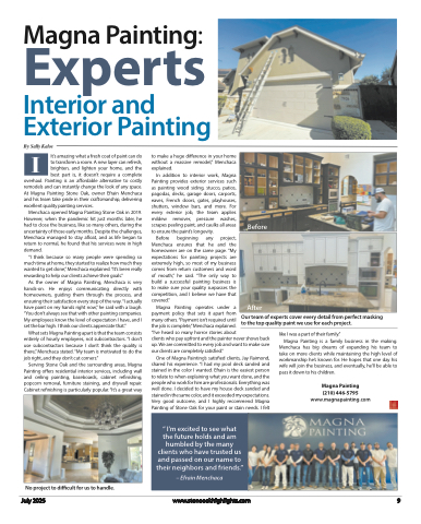 Magna Painting: ExpertsInterior and Exterior PaintingBy Sally KalosI It’s amazing what a fresh coat of paint can do to transform a room. A new layer can refresh, brighten, and lighten your home, and the best part is, it doesn’t require a completeoverhaul. Painting is an affordable alternative to costly remodels and can instantly change the look of any space. At Magna Painting Stone Oak, owner Efrain Menchaca and his team take pride in their craftsmanship, delivering excellent quality painting services.Menchaca opened Magna Painting Stone Oak in 2019. However, when the pandemic hit just months later, he had to close the business, like so many others, during the uncertainty of those early months. Despite the challenges, Menchaca managed to stay afloat, and as life began to return to normal, he found that his services were in high demand.“I think because so many people were spending so much time at home, they started to realize how much they wanted to get done,” Menchaca explained. “It’s been really rewarding to help our clients achieve their goals.”As the owner of Magna Painting, Menchaca is very hands-on. He enjoys communicating directly with homeowners, guiding them through the process, and ensuring their satisfaction every step of the way. “I actually have paint on my hands right now,” he said with a laugh. “You don’t always see that with other painting companies. My employees know the level of expectation I have, and I set the bar high. I think our clients appreciate that.”What sets Magna Painting apart is that the team consists entirely of hourly employees, not subcontractors. “I don’t use subcontractors because I don’t think the quality is there,” Menchaca stated. “My team is motivated to do the job right, and they don’t cut corners.”Serving Stone Oak and the surrounding areas, Magna Painting offers residential interior services, including wall and ceiling painting, baseboards, cabinet refinishing, popcorn removal, furniture staining, and drywall repair. Cabinet refinishing is particularly popular. “It’s a great wayNo project to difficult for us to handle.to make a huge difference in your home without a massive remodel,” Menchaca explained.In addition to interior work, Magna Painting provides exterior services such as painting wood siding, stucco, patios, pagodas, decks, garage doors, carports, eaves, French doors, gates, playhouses, shutters, window bars, and more. For every exterior job, the team applies mildew remover, pressure washes, scrapes peeling paint, and caulks all areas to ensure the paint’s longevity.Before beginning any project, Menchaca ensures that he and the homeowner are on the same page. “My expectations for painting projects are extremely high, so most of my business comes from return customers and word of mouth,” he said. “The only way to build a successful painting business is to make sure your quality surpasses the competition, and I believe we have that covered.”Magna Painting operates under apayment policy that sets it apart frommany others. “Payment isn’t required untilthe job is complete,” Menchaca explained.“I’ve heard so many horror stories aboutclients who pay upfront and the painter never shows back up. We are committed to every job and want to make sure our clients are completely satisfied.”One of Magna Painting’s satisfied clients, Jay Raimond, shared his experience. “I had my pool deck sanded and stained in the color I wanted. Efrain is the easiest person to relate to when explaining what you want done, and the people who work for him are professionals. Everything was well done. I decided to have my house deck sanded and stained in the same color, and it exceeded my expectations. Very good outcome, and I highly recommend Magna Painting of Stone Oak for your paint or stain needs. I feltBeforeAfterOur team of experts cover every detail from perfect masking to the top quality paint we use for each project.like I was a part of their family.”Magna Painting is a family business in the making.Menchaca has big dreams of expanding his team to take on more clients while maintaining the high level of workmanship he’s known for. He hopes that one day his wife will join the business, and eventually, he’ll be able to pass it down to his children.Magna Painting (210) 446-5795 www.magnapainting.com“ I’m excited to see what the future holds and am humbled by the many clients who have trusted us and passed on our name to their neighbors and friends.”– Efrain MenchacaJuly 2025www.stoneoakhighlights.com9