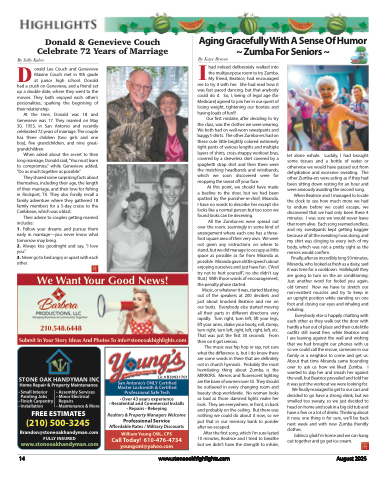 Donald & Genevieve Couch Celebrate 72 Years of MarriageDBy Sally Kalosonald Lee Couch and Genevieve Maxine Couch met in 9th grade at junior high school. Donaldhad a crush on Genevieve, and a friend set up a double date, where they went to the movies. They both enjoyed each other's personalities, sparking the beginning of their relationship.At the time, Donald was 18 and Genevieve was 17. They married on May 30, 1953, in San Antonio and recently celebrated 72 years of marriage. The couple has three children (two girls and one boy), five grandchildren, and nine great- grandchildren.When asked about the secret to their long marriage, Donald said, "You must learn to compromise," while Genevieve added, "Do as much together as possible."They shared some surprising facts about themselves, including their age, the length of their marriage, and their love for fishing in Rockport, TX. They also fondly recall a family adventure where they gathered 18 family members for a 5-day cruise to the Caribbean, which was a blast.Their advice to couples getting married includes:1. Follow your dreams and pursue them early in marriage—you never know what tomorrow may bring.2. Always kiss goodnight and say, "I love you."3. Never go to bed angry or upset with each other.STONE OAK HANDYMAN INC Home Repair & Property MaintenanceAgingGracefullyWithASenseOfHumorBy Kaye Brown~ Zumba For Seniors ~Ime to try it with her. She had read how it was fast paced dancing, but that anybody could do it. So, I, being of legal age (for Medicare) agreed to join her in our quest of losing weight, tightening our booties and having loads of fun!!!Our first mistake, after deciding to try the class, was the clothes we were wearing. We both had on well-worn sweatpants and baggy t-shirts. The other Zumba-ers had on these cute little brightly colored extremely tight pants of various lengths and multiple layers of shirts, cross-strappy workout bras, covered by a sleeveless shirt covered by a spaghetti strap shirt and then there were the matching headbands and wristbands, which we soon discovered were for mopping the sweat off your face.At this point, we should have made a beeline to the door, but we had been spotted by the punisher-in-chief, Miranda. I have no words to describe her except she looks like a normal person but too soon we found looks can be deceiving.All the Zumba-ers were spread out over the room, seemingly in some kind of arrangement where each one has a three- foot square area of their very own. We were not given any instructions on where to stand, but we did manage to occupy as little space as possible as far from Miranda as possible. Miranda gave a little speech about enjoying ourselves and just have fun. ("And try not to hurt yourself", no she didn't say that.) With those words of encouragement, the penalty phase started.Music, or whatever it was, started blasting out of the speakers at 200 decibels and just about knocked Beatrice and me on our butts. Everybody else started moving all their parts in different directions very rapidly. Turn right, turn left, lift your legs, lift your arms, shake your booty, roll, stomp, turn right, turn left, right, left, right, left, etc. That was just the first 30 seconds. From then on it got serious.The music was hip hop or rap, not sure what the difference is, but I do know there are some words in there that are definitely not in church hymnals. Probably the most humiliating thing about Zumba is the MIRRORS. Mirrors and fluorescent lighting are the bane of women over 35. They should be outlawed in every changing room and beauty shop worldwide. No woman looks as bad as those damned lights make her look. They are everywhere, in front, in back and probably on the ceiling. But there was nothing we could do about it now, so we put that in our memory bank to ponder after we escaped.After the first song, which I'm sure lasted 10 minutes, Beatrice and I tried to breathe but we didn't have the strength to inhale,had indeed deliberately walked into the multipurpose room to try Zumba. My friend, Beatrice, had encouragedWe Want Your Good News!210.548.6448Submit In Your Story Ideas And Photos To info@stoneoakhighlights.com• Small Interior Painting Jobs• Finish Carpentry • Installation• Assembly Services • Minor ElectricalRepairs• Maintenance & Morelet alone exhale. Luckily, I had brought some tissues and a bottle of water or otherwise we would have passed out from dehydration and excessive sweating. The other Zumba-ers were acting as if they had been sitting down resting for an hour and were anxiously awaiting the second song.When Beatrice and I managed to locate the clock to see how much more we had to endure before we could escape, we discovered that we had only been there 4 minutes. I was sure we would never leave that room alive. Each song seemed endless, and my sweatpants kept getting baggier because of all the sweating I was doing, and my shirt was clinging to every inch of my body, which was not a pretty sight as the mirrors would confirm.Finally, after an incredibly long 50 minutes, Miranda, who looked as fresh as a daisy, said it was time for a cooldown. Hallelujah! they are going to turn on the air conditioning. Just another word for fooled you again, old timers! Now we have to stretch our non-existent muscles and try to keep in an upright position while standing on one foot and closing our eyes and inhaling and exhaling.Everybody else is happily chatting with each other as they walk out the door with hardly a hair out of place and their cute little outfits still sweat free, while Beatrice and I are leaning against the wall and wishing that we had brought our phones with us so we could call the rescue, someone in our family or a neighbor to come and get us. About that time Miranda came bounding over to ask us how we liked Zumba. I wanted to slap her and smash her against the wall, but Beatrice prevailed and told her it was just the workout we were looking for.We finally manage