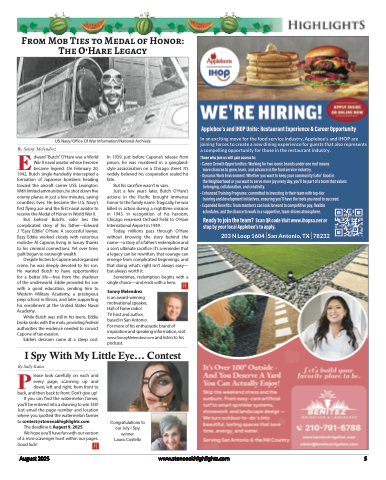 From Mob Ties to Medal of Honor: The O’Hare LegacyUS Navy/Office Of War Information/National ArchivesEBy Sonny Melendrezdward “Butch” O’Hare was a World War II naval aviator whose heroism became legend. On February 20,1942, Butch single-handedly intercepted a formation of Japanese bombers heading toward the aircraft carrier USS Lexington. With limited ammunition, he shot down five enemy planes in just a few minutes, saving countless lives. He became the U.S. Navy’s first flying ace and the first naval aviator to receive the Medal of Honor in World War II.But behind Butch’s valor lies the complicated story of his father—Edward J. “Easy Eddie” O’Hare. A successful lawyer, Easy Eddie worked closely with notorious mobster Al Capone, living in luxury thanks to his criminal connections. Yet over time, guilt began to outweigh wealth.Despite his ties to Capone and organized crime, he was deeply devoted to his son. He wanted Butch to have opportunities for a better life—free from the shadows of the underworld. Eddie provided his son with a good education, sending him to Western Military Academy, a prestigious prep school in Illinois, and later supporting his enrollment at the United States Naval Academy.While Butch was still in his teens, Eddie broke ranks with the mob, providing federal authorities the evidence needed to convict Capone of tax evasion.Eddie’s decision came at a steep cost.In an exciting move for the food service industry, Applebee’s and IHOP are joining forces to create a new dining experience for guests that also represents a compelling opportunity for those in the restaurant industry.I Spy With My Little Eye... ContestPBy Sally Kaloslease look carefully on each and every page, scanning up and down, left and right, from front toback, and then back to front. Don’t give up! If you can find the watermelon farmer, you’ll be entered into a drawing to win $50! Just email the page number and location where you spotted the watermelon farmerto contest@stoneoakhighlights.com. The deadline is August 9, 2025.We hope you’ll have fun with our versionof a mini-scavenger hunt within our pages. Good luck!August 2025www.stoneoakhighlights.com5In 1939, just before Capone’s release from prison, he was murdered in a gangland- style assassination on a Chicago street. It’s widely believed his cooperation sealed his fate.But his sacrifice wasn’t in vain.Just a few years later, Butch O’Hare’s actions in the Pacific brought immense honor to the family name. Tragically, he was killed in action during a nighttime mission in 1943. In recognition of his heroism, Chicago renamed Orchard Field to O’Hare International Airport in 1949.Today, millions pass through O’Hare without knowing the story behind the name—a story of a father’s redemption and a son’s ultimate sacrifice. It’s a reminder that a legacy can be rewritten, that courage can emerge from complicated beginnings, and that doing what’s right isn’t always easy— but always worth it.Sometimes, redemption begins with a single choice—and ends with a hero.Sonny Melendrezis an award-winningmotivational speaker,Hall of Fame radio/TV host and author,based in San Antonio.For more of his enthusiastic brand of inspiration and speaking information, visit www.SonnyMelendrez.com and listen to his podcast.203 N Loop 1604San Antonio, TX78232Congratulations to our July I Spy winner Laura Costello