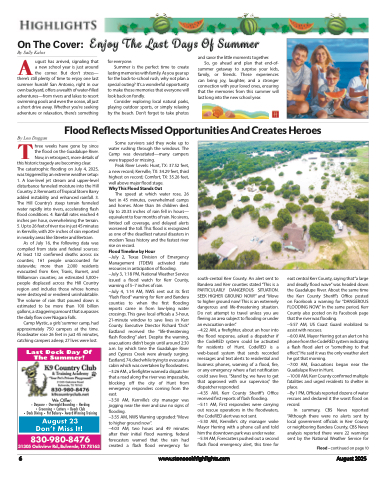 On The Cover: Enjoy The Last Days Of Summerand savor the little moments together.So, go ahead and plan that end-of- summer getaway to surprise your kids, family, or friends. These experiences can bring joy, laughter, and a stronger connection with your loved ones, ensuring that the memories from this summer willlast long into the new school year.TBy Lou Duggan Flood Reflects Missed Opportunities And Creates Heroes hree weeks have gone by since Some survivors said they woke up toy Sally KalosBAugust has arrived, signaling that a new school year is just around the corner. But don’t stress—there’s still plenty of time to enjoy one last summer hurrah! San Antonio, right in our own backyard, offers a wealth of water-filled adventures—from rivers and lakes to resort swimming pools and even the ocean, all just a short drive away. Whether you’re seeking adventure or relaxation, there’s somethingfor everyone.Summer is the perfect time to createlasting memories with family. As you gear up for the back-to-school rush, why not plan a special outing? It’s a wonderful opportunity to make those memories that everyone will look back on fondly.Consider exploring local natural parks, playing outdoor sports, or simply relaxing by the beach. Don’t forget to take photosthe flood on the Guadalupe River. water rushing through the windows. The Now, in retrospect, more details of Camp was devastated—many campersthis historic tragedy are becoming clear. The catastrophic flooding on July 4, 2025, was triggered by an extreme weather setup: 1. A low-level jet stream and upper-level disturbance funneled moisture into the Hill Country. 2. Remnants of Tropical Storm Barry added instability and enhanced rainfall. 3. The Hill Country’s steep terrain funneled water rapidly into rivers, accelerating flash flood conditions. 4. Rainfall rates reached 4 inches per hour, overwhelming the terrain. 5. Up to 26 feet of river rise in just 45 minutes in Kerrville, with 20+ inches of rain reported in nearby areas like Streeter and Bertram.As of July 16, the following data was compiled from state and federal sources: At least 132 confirmed deaths across six counties; 161 people unaccounted for statewide; more than 2,000 residents evacuated from Kerr, Travis, Burnet, and Williamson counties; an estimated 5,000+ people displaced across the Hill Country region and includes those whose homes were destroyed or rendered uninhabitable. The volume of rain that poured down is estimated to be more than 100 billion gallons, a staggering amount that surpasses the daily flow over Niagara Falls.Camp Mystic, a girls’ summer camp, had approximately 750 campers at the time. Floodwater rose 26 feet in just 45 minutes, catching campers asleep; 27 lives were lost.6were trapped or missing.Peak River Levels: Hunt, TX: 37.52 feet,a new record; Kerrville, TX: 34.29 feet, third highest on record; Comfort, TX: 35.26 feet, well above major flood stage.Why This Flood Stands OutThe speed at which water rose, 26 feet in 45 minutes, overwhelmed camps and homes. More than 36 children died. Up to 20.33 inches of rain fell in hours— equivalent to four months of rain. No sirens, limited cell coverage, and delayed alerts worsened the toll. This flood is recognized as one of the deadliest natural disasters in modern Texas history and the fastest river rise on record.Flood Timeline by Hour--July 2, Texas Division of Emergency Management (TDEM) activated state resources in anticipation of flooding.--July 3, 1:18 PM, National Weather Service issued a flood watch for Kerr County, warning of 5–7 inches of rain.--July 4, 1:14 AM, NWS sent out its first “flash flood” warning for Kerr and Bandera counties to when the first flooding reports came in from low-lying water crossings. This gave local officials a 3-hour, 21-minute window to save lives in Kerr County. Executive Director Richard “Dick” Eastland received the “life-threatening flash flooding” alert. Despite the warning, evacuations didn’t begin until around 2:30 a.m. by which time the Guadalupe River and Cypress Creek were already surging. Eastland, 74, died while trying to evacuate a cabin which was overtaken by floodwaters. --3:26 AM., a firefighter warned a dispatcher that a road along the river was impassable, blocking off the city of Hunt from emergency responders coming from the east.--3:30 AM, Kerrville’s city manager was jogging near the river and saw no signs of flooding.--3:35 AM, NWS Warning upgraded: “Move to higher ground now”.--4:03 AM, two hours and 49 minutes after their initial flood warning, federal forecasters warned that the rain had created a flash flood emergency forsouth-central Kerr County. An alert sent to Bandera and Kerr counties stated “This is a PARTICULARLY DANGEROUS SITUATION. SEEK HIGHER GROUND NOW!” and “Move to higher ground now! This is an extremely dangerous and life-threatening situation. Do not attempt to travel unless you are fleeing an area subject to flooding or under an evacuation order.”--4:22 AM, a firefighter, about an hour into the flood response, asked a dispatcher if the CodeRED system could be activated for residents of Hunt. CodeRED is a web-based system that sends recorded messages and text alerts to residential and business phones, warning of a flood, fire, or any emergency where a fast notification could save lives. “Stand by, we have to get that approved with our supervisor,” the dispatcher responded.--4:35 AM, Kerr County Sheriff’s Office received first reports of flash flooding. --5:11 AM, First responders were carrying out rescue operations in the floodwaters, the CodeRED alert was not sent.--5:30 AM, Kerrville’s city manager woke Mayor Herring with a phone call and told him the downtown park was under water. --5:34 AM, Forecasters pushed out a second flash flood emergency alert, this time foreast central Kerr County, saying that “a large and deadly flood wave” was headed down the Guadalupe River. Abo