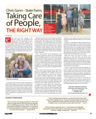 Chris Gann - State Farm: Taking Careof People,Far left –Valeria Ruano Jaine Rodriguez Chris Gann Zachary Montalvo Marcie SilversTHE RIGHT WAYBy Sally KalosC Chris Gann has been working in the insurance industry since graduating from college in 2014. His journey began as a sales representative and office manager for a State Farm agent in the Austin-Round Rock area, where he worked for about three years. In 2017, Chris made the bold decision to move to San Antonio and open his own State Farm agency, located at the intersection of Stone Oak Parkway and Hardy Oak. Fast forward to 2025, and he will be celebrating eight successful years with his office and 11years in the industry.What sets Chris apart is his commitment to educating his clients about their coverage options. While many people compare policies based solely on price, Chris emphasizes the importance of understanding what each policy covers and what it does not. One of the most common mistakes people make when shopping for auto insurance is choosing a policy based on price alone, without considering the necessary liability coverage. Chris’s agency takes the time to explain these details to ensure that clients are fully informed about their coverage and how it applies to their everyday life.Chris is also passionate about supporting his local community. He has been a sponsor for the Reagan High School cheerleading program for several years and has recently joined the board of directors for the Bulverde Humane Society, an organization he has supported for a long time. As a big animal lover, Chris has three dogs of his own and often helps the Humane Society by donating cat supplies, as the organization tends to receive fewer donations for cats than for dogs. His consistent support and dedication to the cause led to his appointment to the board.When it comes to homeowners’ insurance, Chris advises that one of the biggest mistakes people make is not checking for replacement cost coverage on their roofs. This is especially important in Texas, where hailstorms are common. Without replacement cost coverage, homeowners may find themselves paying out of pocket for repairs after a storm, even if the damage is significant. Chris recommends that clients compare policies not just on price but on the type of coverage, deductibles, and whether the policy includes replacement cost coverage.In addition to coverage details, Chris emphasizes the importance of choosing a reliable insurance company. He advises clients to check the financial strength of the company, as well as the claims process. If a major event like a storm occurs, the company needs to have the resources to handle claims quickly and effectively. Chris’s office works with one of the most financially stable and trustedcompanies in the industry, which gives clients peace of mind knowing that they will be taken care of in the event of a claim.State Farm is celebrating its 104th anniversary, and one thing that surprises people is the sheer number of agents across the country. With more State Farm agents than McDonald’s locations, the company processes hundreds of thousands of claims each day. What makes Chris’s office stand out is the close-knit, family-like culture among his team members. Chris believes that taking care of people the right way will lead to success, and he takes pride in educating clients and helping them save money.What Chris enjoys most about his business is the opportunity to meet with clients and provide them with personalized advice. As a people person, he finds satisfaction in helping clients put themselves in the best possible position should something unfortunate happen. He understands that when a claim occurs, his office will be one of the first calls, and he wants to ensure that clients are well-prepared for such situations.Chris is a proud Texas State University graduate, and his roots run deep in Texas. He grew up in Round Rock, went to college in San Marcos, and has lived in Austin and San Antonio for the past decade. He and his beautiful wife, Aubrey, have three young children, including two daughters and a son. Together, they are navigating life and enjoying the adventure, just like everyone else.Chris’s dedication to his clients, his community, and his team makes his State Farm office a trusted name in San Antonio. Whether it’s protecting homes, autos, or businesses, Chris Gann and his team are committed to providing the highest level of service to their clients.Chris Gann- State Farm Insurance20079 Stone Oak Parkway Suite 1106 San Antonio, TX 78258(210) 656-1450 www.chrisganntheinsuranceman.comChris Gann and familyAt his agency, Chris and his team offer a wide range of property and casualty insurance products, including auto, home, renters and business insurance. They also provide financial services such as life insurance, health insurance, working closely with U.S. Bank to offer banking products. As the largest insurance company in the nation, State Farm has built a reputation for keeping promises and paying claims, something that particularly drew Chris to the company.Customer Testimonials“We moved all of our business policies to Chris’ firm when our agent retired. They have done an amazing job in continuing great service. Marcie in his office is instrumental and quick to help answer our questions, provide documentation, and ensure we are taken care of on the various policies.” — Joanne MC-R.“I have nothing but good things to say about this State Farm office. Chris Gann and his team are very professional and offer the best service. I just recently filed a claim, and they were able to help me with ease.I wouldn’t want to work with any other office in the city.” — Gary V.“Chris provided exceptional service—professional, knowledgeable, and quick to respond. He made the entire insurance process simple and stress-free. Highly recommend.” — Ross MG.August 2025www.stoneoakhighlights.com 9