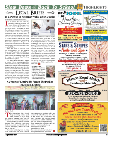 Legal BriefsIs a Power of Attorney Valid after Death?IBy Kathleen Cassidy Goodman, PLLCn my opinion, the most commonly misunderstood legal document is a “Power of Attorney”. Time after time,I hear from someone after their loved one has passed away, “I can tend to all of his financial matters because I am his power of attorney.” This mistaken understanding regarding a Power of Attorney leads to many unforseen consequences. Frequently, someone does not understand the “power” of this document and entrusts their agent with specific instructions to follow after their death. But, because the power of attorney “dies” when the person who signed the document dies, their expectations will never be fulfilled.While the Power of Attorney does not survive death, it is a very powerful document. A Texas Statutory Durable Power of Attorney allows a person to designate a family member or close friend as their agent to manage their financial affairs. The Texas format offers two options.One option allows the agent’s powers to become effective immediately and the other option requires a physician determine the person is mentally incapacitated before the agent’s power becomes valid. Normally, most spouses are able to manage the bank accounts for each other and tend to each other’s financial affairs, But, even married couples need a Power of Attorney. Consider the situation where one spouse becomes incapacitated and because of the incapacity, the other spouse needs to downsize, sellSCHOOL HometownYour Pet Deserves The BestBackToSPECIALSGET A CHOICE OF...30% off Initial Cleaning $160 - 4 Hour Priority Clean43 Years of Stirring Up Fun At The Medina Lake Cajun FestivalTBy Ron Clarkehe Medina Lake Cajun Festival keeps on rolling out the good times, bringing the music, foodand culture of Louisiana to the Texas Hill Country for fun the whole family can enjoy. Visitors can listen and dance to topnotchLouisiana Cajun and Zydeco music, taste the best homemade Cajun food this side of Louisiana, and sample gumbos in the Great Gumbo Cook-off.The festival is Saturday, Sept. 28, 2024, 11:00 am to 10:00 pm at the LakehillsSoil MixesCompostBaseSandTopsoilSeptember 2024www.stoneoakhighlights.com15the house, and move to assisted living. The incapacitated spouse is not able to sign the documents to sell the house. However, if the incapacitated spouse has a power of attorney, then there is no problem. A power of Attorney alleviates the need for a guardianship in many instances. As with all legal documents, the person signing the Power of Attorney must have mental capacity to sign the document. Frequently, a son or daughter will recognize they need to help Mom or Dad out with their financial matters only after their parent’s Dementia or Alzheimer’s becomes severe – and it it too late. Everyone needs to plan ahead and execute a Power of Attorney before the need arises.• Daycare • Overnight Boarding • Grooming • Cattery • Beach Club • Dock Diving • Pet Bakery • Award Winning TrainingBack To School Special10% OFF any In House Training Session during Daycare or Boarding. Advance Reservation NecessaryMust mention this ad. Exp. 9/30/24k9countryclub.net830-980-8476 31305 Oakview Dr., Bulverde, TX 78163We Pledge To Adhere To The Highest Industry Standards• Pedicures • Manicures • Dipping Powder• Solar Nails • Waxing • Complimentary DrinksKathleen Cassidy Goodman is an attorney20% O on all services over $50! Valid til September 30, 2024Cleaning Services FREE Estimates!Call Today! 210-438-7359 www.hometowncleaningtx.comMon-Sat: 9:00am-7:30 pm ~ Sun: 11am-6:30pmIn Trader Joe’s Shopping Center427 North Loop 1604 W, Suite 111 San Antonio, TX 78258SEPTEMBER SPECIALSouth Texas Blend RockMulch(210) 999-5419in areas of estate planning, starsstripesnailssanantonio.comprobate, civil litigation,and business law. She can Decomposed be reached at her office inHelotes at (210) 949-1000 Graniteor for more information,visit www.bexarlaw.comCommunity Center. Admission is $15, and children 10 and under enter free. There is free parking and shuttle service. For more information visit www.cajunfestival- medinalake.com , call 830-460-0600 or 210- 885-6435 or e-mail bengel@lhcctx.org Press Inquiries: 830-460-0600 or 210-885- 6435 or e-mail bengel@lhcctx.orgWebsite: www.cajunfestival medinalake.com www. facebookmedinalakecajunfestival.com Instagram:MedinaLakeCajunFestival830-438-580331767 Blanco Road, Bulverde, TX 78163 Hours: Mon- Fri-8am-5pm • Sat. 8am- 3pmwww.BlancoRdMulch.com43rd AnnualRain or ShineBring in ad for Buy 1/Get 1 at GateSaturday - Sept 28thLakehills Community Center 11225 Park Road 37Gates Open 11am-10pmNEW! Zydeco Party FREE admission after 8pmHome of the Great Gumbo CookoffAdvance Admission & Multi-Pack Discounts www.cajunfestival-medinalake.comor scan the QR codeLakehills TX