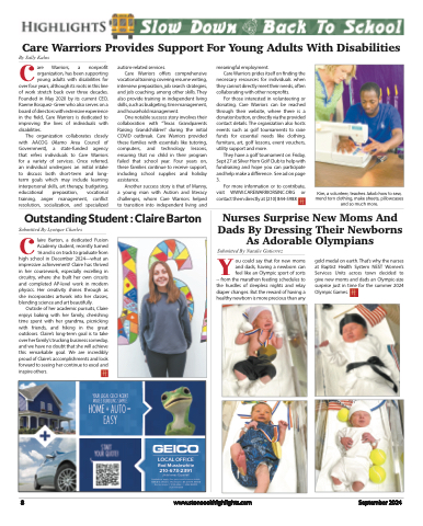 Care Warriors Provides Support For Young Adults With DisabilitiesBCy Sally Kalosare Warriors, a nonprofitorganization, has been supportingyoung adults with disabilities for over four years, although its roots in this line of work stretch back over three decades. Founded in May 2020 by its current CEO, Raeme Bosquez- Greer who also serves on a board of directors with extensive experience in the field, Care Warriors is dedicated to improving the lives of individuals with disabilities.The organization collaborates closely with AACOG (Alamo Area Council of Government), a state-funded agency that refers individuals to Care Warriors for a variety of services. Once referred, an individual undergoes an initial intake to discuss both short-term and long- term goals which may include learning interpersonal skills, art therapy, budgeting, educational preparation, vocational training, anger management, conflict resolution, socialization, and specializedautism-related services.Care Warriors offers comprehensivevocational training covering resume writing, interview preparation, job search strategies, and job coaching, among other skills. They also provide training in independent living skills, such as budgeting, time management, and household management.One notable success story involves their collaboration with “Texas Grandparents Raising Grandchildren” during the initial COVID outbreak. Care Warriors provided these families with essentials like tutoring, computers, and technology lessons, ensuring that no child in their program failed that school year. Four years on, these families continue to receive support, including school supplies and holiday assistance.Another success story is that of Manny, a young man with Autism and literacy challenges, whom Care Warriors helped to transition into independent living andmeaningful employment.Care Warriors prides itself on finding thenecessary resources for individuals when they cannot directly meet their needs, often collaborating with other nonprofits.For those interested in volunteering or donating, Care Warriors can be reached through their website, where there is a donation button, or directly via the provided contact details. The organization also hosts events such as golf tournaments to raise funds for essential needs like clothing, furniture, art, golf lessons, event vouchers, utility support and more.They have a golf tournament on Friday, Sept 27 at Silver Horn Golf Club to help with fundraising and hope you can participate and help make a difference. See ad on page 3.For more information or to contribute, visit WWW.CAREWARRIORSINC.ORG or contact them directly at (210) 844-5988Kim, a volunteer, teaches Jakob how to sew, mend torn clothing, make sheets, pillowcases and so much more.Outstanding Student : Claire BartonNurses Surprise New Moms AndDads By Dressing Their NewbornsAs Adorable OlympiansSChigh school in December 2024—what animpressive achievement! Claire has thrived in her coursework, especially excelling in circuitry, where she built her own circuits and completed AP-level work in modern physics. Her creativity shines through as she incorporates artwork into her classes, blending science and art beautifully.Outside of her academic pursuits, Claire enjoys baking with her family, cherishing time spent with her grandma, picnicking with friends, and hiking in the great outdoors. Claire’s long-term goal is to take over her family’s trucking business someday, and we have no doubt that she will achieve this remarkable goal. We are incredibly proud of Claire’s accomplishments and look forward to seeing her continue to excel and inspire others.ubmitted By Lynique Charleslaire Barton, a dedicated Fusion Academy student, recently turned 16 and is on track to graduate fromYSubmitted By Natalie Gutierrezou could say that for new momsand dads, having a newborn canfeel like an Olympic sport of sorts -- from the marathon feeding schedules to the hurdles of sleepless nights and relay diaper changes. But the reward of having a healthy newborn is more precious than anygold medal on earth. That’s why the nurses at Baptist Health System NEST Women’s Services Units across town decided to give new moms and dads an Olympic-size surprise just in time for the summer 2024 Olympic Games.your local geico agent makes bundling simple.Home + Auto = easyLOCAL OFFICERod Musslewhite210-673-2391¡Hablamos Español!Limitations apply. See geico.com for more details. GEICO & affiliates. Washington, DC 20076. GEICO Gecko image © 1999-2022. © 2022 GEICO. 21_6333121298 www.stoneoakhighlights.comSeptember 2024