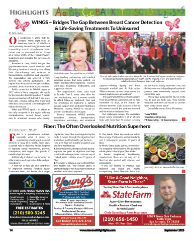 By Sally KalosOn September 4, 2025, Ruth M. Gonzales marks eight years as Executive Director of WINGS—a 100% privately funded 501(c)(3) dedicated to providing no-cost, comprehensive breast cancer care to uninsured women living at or below 250% of the Federal Poverty Guidelines and ineligible for government assistance.Founded in 1999, WINGS bridges the gap between breast cancer detection and life-saving treatment, covering everything from chemotherapy and radiation to transportation, prosthetics, and education. The organization has achieved a 95% survival rate among participants—14% higher than the national average—and has provided care to more than 20,000 women.Ruth’s connection to WINGS began in 2017 when a friend suggested she apply for the Executive Director position. A breast cancer survivor herself, Ruth felt it was more than a job—it was a calling. After prayer and reflection, she accepted, committing herself fully to the mission.What sets WINGS apart is its status as the only non-profit in the region offering comprehensive, no-cost breast cancer care to uninsured women who qualify.Ruth M. Gonzales, Executive Director of WINGS.Long-standing partnerships with medical providers ensure that every patient—no matter the stage of her diagnosis—receives world-class treatment, medications, and supportive services.The organization’s roots trace back to founder Terri B. Jones, who, after her own mastectomy, met a woman unable to afford follow-up treatment. Terri and her oncologist, Dr. Katherine L. Safford, secured support from Methodist Healthcare Ministries, creating WINGS to ensure no woman faced such a choice again.Beyond treatment, WINGS provides translation services, transportation, educational workshops, and emotionalPost pic with patients after a monthly Wings for Life Survivorship Program workshop designed to educate participants regarding heart health and the impacts of pre- and post-chemo/ radiation treatments supporting overall wellness.FBy Caitlin Ogletree, MS, RDiber is a powerhouse nutrient,especially when it comes tomaintaining a healthy gut- a crucial element of long term health. Fiber plays a pivotal role in digestive health, helping to regulate bowel movements, prevent constipation, and support the growth of beneficial gut bacteria.Additionally, it’s linked to a reduction in inflammation and supports a balanced gut microbiome.A diet rich in fiber can also contribute to improved immune function, lower cholesterol levels, and better blood sugarSTONE OAK HANDYMAN INC Home Repair & Property Maintenanceregulation. Since fiber is not digested by the body, it passes through the digestive tract and acts as food for healthy gut bacteria. Here are 5 fiber-rich foods to include in your diet for a healthier gut:1. Legumes (lentils, chickpeas, black beans)- legumes are great for digestion and help stabilize blood sugar levels. Just one cup of cooked lentils contains about 15 grams of fiber.2. Avocados- a delicious source of both fiber and healthy fats. They contain about 10 grams of fiber per half fruit, making them an excellent addition to any meal.3. Chia Seeds- These tiny seeds are rich in fiber, omega-3 fatty acids, and antioxidants. Just 2 tablespoons provide 10 grams of fiber.4. Whole Grains (oats, quinoa, brown rice)- Try swapping refined grains (like pasta) for whole grains to boost your fiber intake.5. Berries (raspberries, blackberries, strawberries)- these are not only rich in fiber but also packed with vitamins and antioxidants.If you are looking to improve your digestion and boost gut health, incorporating these fiber-rich foods intoyour daily diet is an easy and effective way.WINGS ~ Bridges The Gap Between Breast Cancer Detection & Life-Saving Treatments To Uninsuredsupport—offering dignity and hope alongside medical care. As Ruth notes, “When a woman survives breast cancer, the impact ripples across generations.”This year marks WINGS’25th anniversary. Their Silver WINGS Celebration will be held December 11, 2025, at the historic San Antonio Women’s Club Mansion to honor the women served, the partners involved, and the mission that saves lives.But challenges remain. The metastatic breast cancer population is at an all-time high, with more than 75 women currentlyon the waitlist. Rising treatment costs and the intensive work of guiding each patient’s journey make community support more critical than ever.“If you have a passion for life, we invite you to join us,” Ruth says. “Your talents, treasures, and time can ensure no woman faces breast cancer alone.”Every dollar counts. Every life matters.Texas WINGS www.texaswings.orgFB: texaswings | IG: texaswingssaFiber: The Often Overlooked Nutrition SuperheroLic.# B30931701San Antonio’s ONLY Certified Master Locksmith & Certified Professional Safe Tech• Over 43 years experience• Residential and Commercial Installs • Repairs • RekeyingRealtors & Property Managers WelcomeProfessional ServiceAffordable Rates / Military DiscountsWilliam Young CML, CPSCallToday! 610-476-4734 youngcml@yahoo.com“ Like A Good Neighbor, State Farm Is There”Serving Stone Oak & Surrounding AreasAuto • Life • Homeowners Health • Renters • Business Se Habla EspañolChris Gann State Farm Insurance(210) 656-1450Mon. - Fri. 9am - 5pm20079 Stone Oak Parkway Suite 1106San Antonio, TX 78258 www.chrisganntheinsuranceman.com• Small Interior Painting Jobs• Finish Carpentry • Installation• Assembly Services • Minor ElectricalRepairs• Maintenance & MoreFREE ESTIMATES(210) 500-3245Brandon@stoneoakhandyman.com FULLY INSURED www.stoneoakhandyman.com14www.stoneoakhighlights.comSeptember 2025