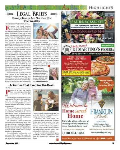 Legal BriefsFamily Trusts Are Not Just For The WealthyEBy Kathleen Cassidy Goodman, PLLCveryone has heard someone referred to as a “trust baby,” and the assumption is that he or she isthe child of a wealthy parent. But that is not always the situation. A Trust may be used by just ordinary people with a house and small savings. Contrary to the wide spread belief, a Trust is a method some parents, or a spouse, use to protect their loved ones from being taken advantage of or to protect their beneficiaries from themselves. While a Will is used to transfer your assets to individuals upon your death, a Trust can contain provisions that limit the amount of money a beneficiary is to receive. You can even set out the method to disburse your gift to them over time. You may have concerns about a beneficiary’s ability to manage his or her affairs, or you may have a vulnerable child. With a Trust you can limit a beneficiary’s ability to access all of their inheritance all at one time. You can distribute a small amount of a beneficiary’s inheritance at regular intervals, to prevent them from making bad choices or being taken advantage of by others.Assets held in Trust are usually protected from creditors of the beneficiaries. For example, if you pass away and give your assets to your children in your Will, upon your death they may never see the money. If they are deep in debt, their creditors maySATURDAY MARKETCustom handcrafted faux floral wreaths and arrangements for your home, office or special event.Inside The Oasis Salon Suites & Spa1826 N Loop 1604 W, Suite 100, San Antonio, TX 78248 | 210.951.0101(210) 277-0065 • dimartinospizzeriasa.com• Pizza • Calzones• Salads • Subs • WingsBUSINESS HOURS:Mon: Closed • Tue - Thu: 11am- 9pm Fri & Sat 11am-10pm • Sun. Closed25020 Blanco Rd, Suite 130 San Antonio, TX 78260We Deliver!$5.00 OFF any specialty pizza! Bring in or mention this ad • Expires 9-30-25We Are Almost FULL, Come See Why!!Welcome toHome sweet HomeCome take a tour and enjoy an amazing culinary experience in our beautiful dining room!Call Tina for more information!(210) 404-144418323 Sonterra Place San Antonio, Texas 78258Independent and Assisted Livingwww.franklinpark.orgLearn More About Us at...franklinpark.org#104458OPPORTUNITYtake their inheritance – the money you worked so hard to obtain.Another valuable benefit of a Trust is that a Trust can be used if you become incapacitated. Even though you are incapacitated, your Trust can continue to manage your private assets without the need for any court involvement. A Trust is not normally filed with the Courts and the details and the amount of your estate may be kept private. Yes, a Trust is more expensive initially, but if properly prepared and operated during your life, your beneficiaries will be able to avoid probate and the associated fees.Kathleen Cassidy Goodman is an attorney in areas of estate planning, probate, civil litigation, and business law. She can be reached at her office in Helotes at (210) 949-1000 or for more information, visit www.bexarlaw.comActivities That Exercise The BrainPBy Stafflives.Speaking a new language opens up newopportunities for travel and socialization and also strengthens the brain. This enhanced connectivity might play a role in delaying the onset of dementias, according to researchers.Trying something new might stimulate the brain in ways that improve its function. A cognitively demanding skill, such as photography, playing an instrument and other activities could enhance memory function. Teaching such skills to others also can reinforce brain functions.The Centers for Disease Control and Prevention says that dancing might help combat Alzheimer's disease by improving bloodcirculationthroughoutthebody.Italso forces a person's memory and processing speed to work at a higher capacity through learning the choreography.Crossword puzzles, word searches, word games, and brain teaser-like puzzles are entertaining and work the brain. Research has shown that even doing jigsaw puzzleseople of all ages can benefit from incorporating activities that exercise the brain into their daily"recruits multiple cognitive abilities and is a protective factor for visuospatial cognitive aging," according to Healthline.Socializing with other people can stimulate attention and memory. This helps to strengthen neural networks in the brain that makes the brain work harder. This increase in mental activity can pay off in the long run. Socialization is also beneficial for mental health, especially among older adults who tend to be more isolated.People are often concerned with giving their bodies a workout, but they also should focus on activities that strengthen their brains.September 2025www.stoneoakhighlights.com 15EQUAL HOUSING