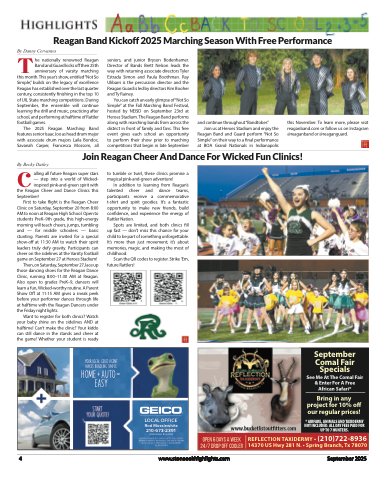 Reagan Band Kickoff 2025 Marching Season With Free PerformanceBTy Danny Cervanteshe nationally renowned Reagan Band and Guard kicks off their 25th anniversary of varsity marchingthis month. This year’s show, entitled“Not So Simple,” builds on the legacy of excellence Reagan has established over the last quarter century, consistently finishing in the top 10 of UIL State marching competitions. During September, the ensemble will continue learning the drill and music, practicing after school, and performing at halftime of Rattler football games.The 2025 Reagan Marching Band features senior Isaac Joo as head drum major with associate drum majors Laila Bondoc, Savanah Carper, Francesca Mossom, allseniors, and junior Bryson Bodenhamer. Director of Bands Brett Nelson leads the way with returning associate directors Tyler Estrada Simon and Paula Boothman. Ray Ulibarri is the percussion director and the Reagan Guard is led by directors Kim Booher and Ty Rainey.Youcancatchanearlyglimpseof“NotSo Simple” at the Fall Marching Band Festival, hosted by NEISD on September 23rd at Heroes Stadium. The Reagan Band performs along with marching bands from across the district in front of family and fans. This free event gives each school an opportunity to perform their show prior to marching competitions that begin in late Septemberand continue throughout “Bandtober.”Join us at Heroes Stadium and enjoy the Reagan Band and Guard perform “Not So Simple” on their way to a final performance at BOA Grand Nationals in Indianapolisthis November. To learn more, please visit reaganband.com or follow us on Instagram @reaganband or @reaganguard.Join Reagan Cheer And Dance For Wicked Fun Clinics!CBy Becky Daileyalling all future Reagan super stars — step into a world of Wicked- inspired pink-and-green spirit withthe Reagan Cheer and Dance Clinics this September!First to take flight is the Reagan Cheer Clinic on Saturday, September 20 from 8:00 AM to noon at Reagan High School. Open to students PreK–9th grade, this high-energy morning will teach cheers, jumps, tumbling and — for middle schoolers — basic stunting. Parents are invited for a special show-off at 11:30 AM to watch their spirit leaders truly defy gravity. Participants can cheer on the sidelines at the Varsity football game on September 27 at Heroes Stadium!Then, on Saturday, September 27, lace up those dancing shoes for the Reagan Dance Clinic, running 8:00–11:30 AM at Reagan. Also open to grades PreK–9, dancers will learn a fun, Wicked-worthy routine. A Parent Show Off at 11:15 AM gives a sneak peek before your performer dances through life at halftime with the Reagan Dancers under the Friday night lights.Want to register for both clinics? Watch your baby shine on the sidelines AND at halftime! Can’t make the clinic? Your kiddo can still dance in the stands and cheer at the game! Whether your student is readyto tumble or twirl, these clinics promise a magical pink-and-green adventure!In addition to learning from Reagan’s talented cheer and dance teams, participants receive a commemorative t-shirt and spirit goodies. It’s a fantastic opportunity to make new friends, build confidence, and experience the energy of Rattler Nation.Spots are limited, and both clinics fill up fast — don’t miss this chance for your child to be part of something unforgettable. It’s more than just movement; it’s about memories, magic, and making the most of childhood.Scan the QR codes to register. Strike ’Em, future Rattlers!your local geico agent makes bundling simple.Home + Auto = easyLOCAL OFFICERod Musslewhite210-673-2391¡Hablamos Español!Limitations apply. See geico.com for more details. GEICO & affiliates. Washington, DC 20076. GEICO Gecko image © 1999-2022. © 2022 GEICO. 21_633312129www.bucketlistoutfitters.comSeptember Comal Fair SpecialsSee Me At The Comal Fair & Enter For A Free African Safari*Bring in any project for 10% off our regular prices!* AIRFARE, ANIMALS AND TAXIDERMY NOT INCLUDED. ALL DAY FEES PAID FOR UP TO 7 HUNTERS.Open 6 Days A Week REFLECTION TAXIDERMY • (210)722-8936 24/7 Drop Off Cooler 14370 US Hwy 281 N. • Spring Branch, Tx 780704www.stoneoakhighlights.comSeptember 2025