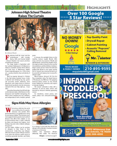 Johnson High School Theatre Raises The CurtainOver 100 Google 5 Star Reviews!NO MONEY DOWN!5 Star Rating!• Top Quality Paint• Drywall Repair• Cabinet Painting• Acoustic “Popcorn” Ceiling RemovalINTERIOR & EXTERIORSTEXAS BASED& FAMILY OWNEDCALL FOR YOUR FREE ESTIMATE210-895-9595mrpainter895gmail.comBFy Johnson Theatreeaturing both the classic and the contemporary - with comedy, drama, chills, and musical delight- Johnson Theatre’s new season promises something for everyone.The magic begins in September with Ken Ludwig’s Shakespeare in Hollywood, a hilarious screwball comedy where Oberon and Puck from A Midsummer Night’s Dream magically appear on a 1930s movie set—causing romantic chaos and plenty of laughs.Back by popular demand in October is the hair-raising haunted house. Under a tattered and terrifying big top, guests will encounter sinister sideshows, eerie attractions, and creepy clowns as Johnson High School transforms into the immersive Carnival of the Lost. Step right up... if you dare!November brings Kate Hamill’s fresh take on the beloved classic, Little Women. In this fast-paced and heartfelt reimagining, the March sisters navigate love, loss, ambition, and independence with a modern, spiritedpulse.In January, the spotlight shines on thedazzling musical, Legally Blonde. With music and lyrics by Laurence O’Keefe and Nell Benjamin, and book by Heather Hach, this stage sensation is based on the novel by Amanda Brown and the hit Metro-Goldwyn- Mayer motion picture. Follow the bold and brilliant Elle Woods as she swaps sorority life for Harvard Law, proving that pink can be powerful and staying true to yourself is always in style.March features Johnson’s UIL One Act Play competition entry, The Sweet Science of Bruising by Joy Wilkinson. This gripping historical drama centers on four female boxers fighting for autonomy and respect in Victorian England.The season culminates in May with a showcase of one-act plays chosen and directed by Johnson’s talented graduating seniors.For showtimes, season passes, and tickets, please visit: www.johnsontheatre. com• Outdoor Classroom• STEM based education • Indoor Gym• Tech RoomNow Enrolling! Schedule A TourFull & Part Time Enrollment Opportunities!OFFERING AFTER SCHOOL BUS PICK UP FROM:Tuscany Heights, Hardy Oak, Canyon Ridge, Specht & Wilderness Oaktheprepschools.com24372 Wilderness Oak San Antonio, TX 78258 (210) 966-4590Signs Kids May Have AllergiesBy StaffWelcoming a child into the world is an exciting time for parents. However, new parents often lament that there is no guidebook to caring for and raising children. This becomes even more apparent when parents must confront illnesses that affect their children. It can be disconcerting when a child is affected by illness and parents feel helpless. Such feelings may arise when children’s allergies first present.Just like adults, children can be sensitive to allergens in their foods or their environments. Cedars-Sinai says allergies affect the immune system. Allergic reactions occur when the immune system reacts to something generally harmless and thinksSeptember 2025it is a danger. So the body then attacks the allergen with antibodies, causing a number of reactions in the body.Children may experience allergies differently than adults. The AmericanAllergies - continued on page 8www.stoneoakhighlights.com 7